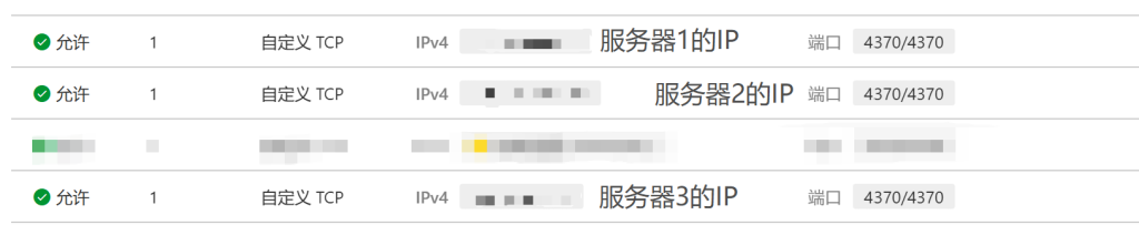 对Erlang通讯所用的4370端口,不能允许所有IP访问,只允许集群内的服务器访问,比如洛凯集群有三台服务器,那阿里云可以进行如下设置: