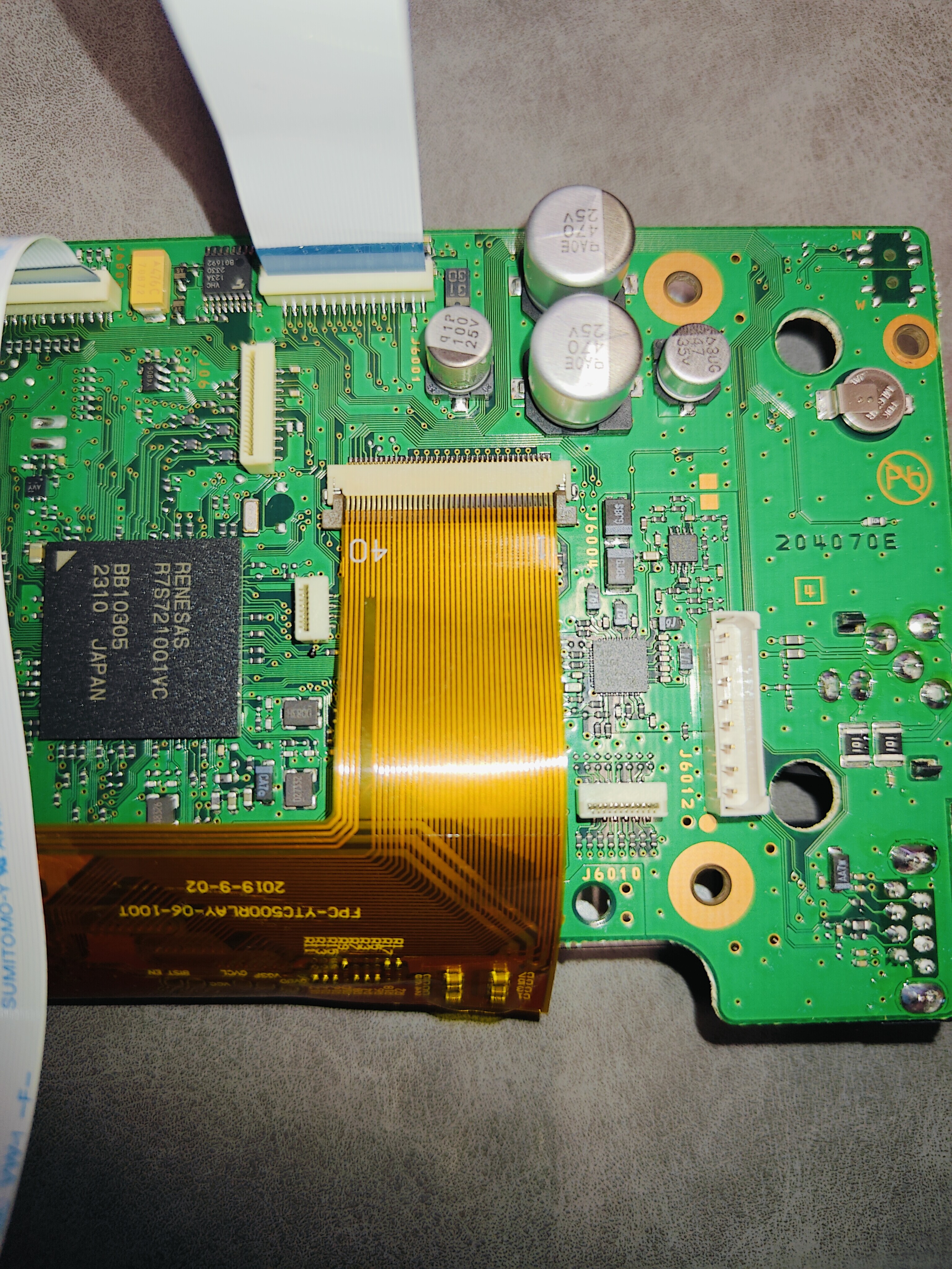 板子的右下角是机器的CPU,型号R5F61645FPV,是一颗来自瑞萨的32位处理器,主频50MHz;右侧的R5F56519ADFP则是同样来自瑞萨的使用RXv2内核的32位单片机,最大时钟频率120MHz: